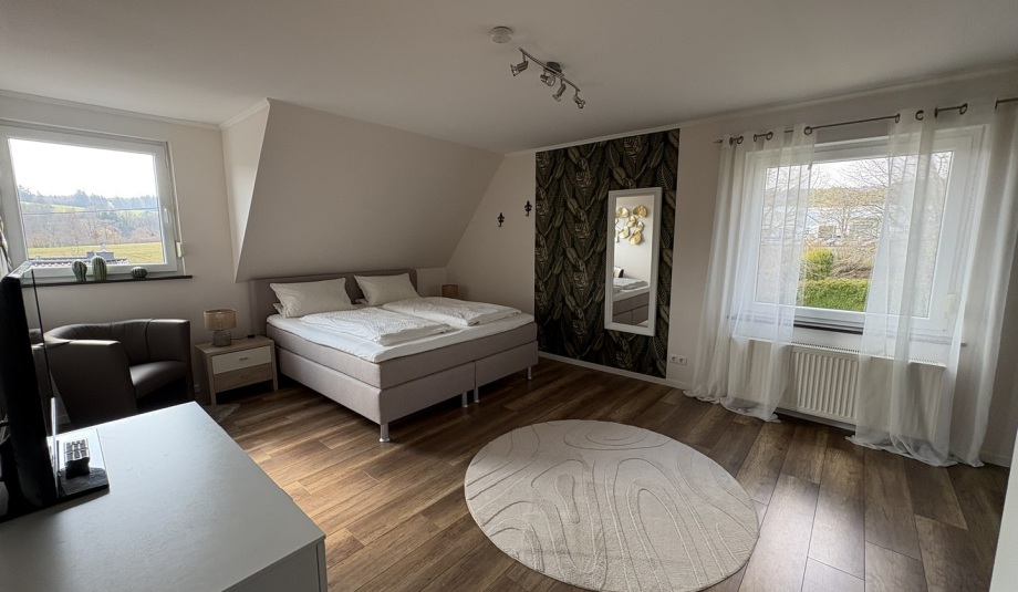 Unsere Ferienwohnung besteht aus einem Schlafzimmer mit Doppelbett, Badezimmer sowie einer Kombination aus Küche und Wohnzimmer. Die Küche ist komplett ausgestattet mit Herd/Backofen, Mikrowelle und Spülmaschine. Die Couch kann als Schlafsofa für die 3. und 4. Person genutzt werden. Im Schlafzimmer sowie im Wohnbereich befindet sich jeweils ein Flachbildfernseher. Die Wohnung befindet sich im ersten Obergeschoss.