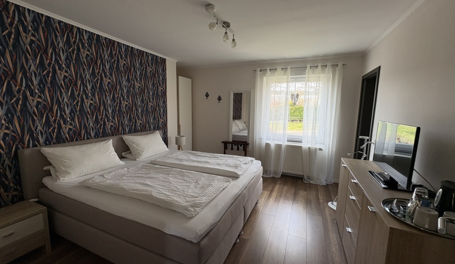 Unsere modern eingerichteten Gästezimmer in warmen Naturtönen laden zum Erholen und Entspannen ein. Jedes Zimmer ist mit einem Flachbildfernseher ausgestattet und verfügt über ein eigenes Badezimmer mit Dusche/WC sowie einem Föhn. Sie haben auch die Möglichkeit sich einen Kaffee oder Tee in Ihrem Zimmer zuzubereiten. Das Bad ist direkt mit dem Schlafzimmer verbunden. Dieses Zimmer befindet sich im Erdgeschoss.